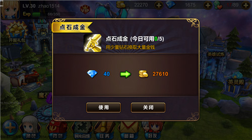 玩家可通过点石成金,将少量钻石兑换成大量金币。每天可使用一定次数。玩家可以通过提升VIP等级来增加次数。